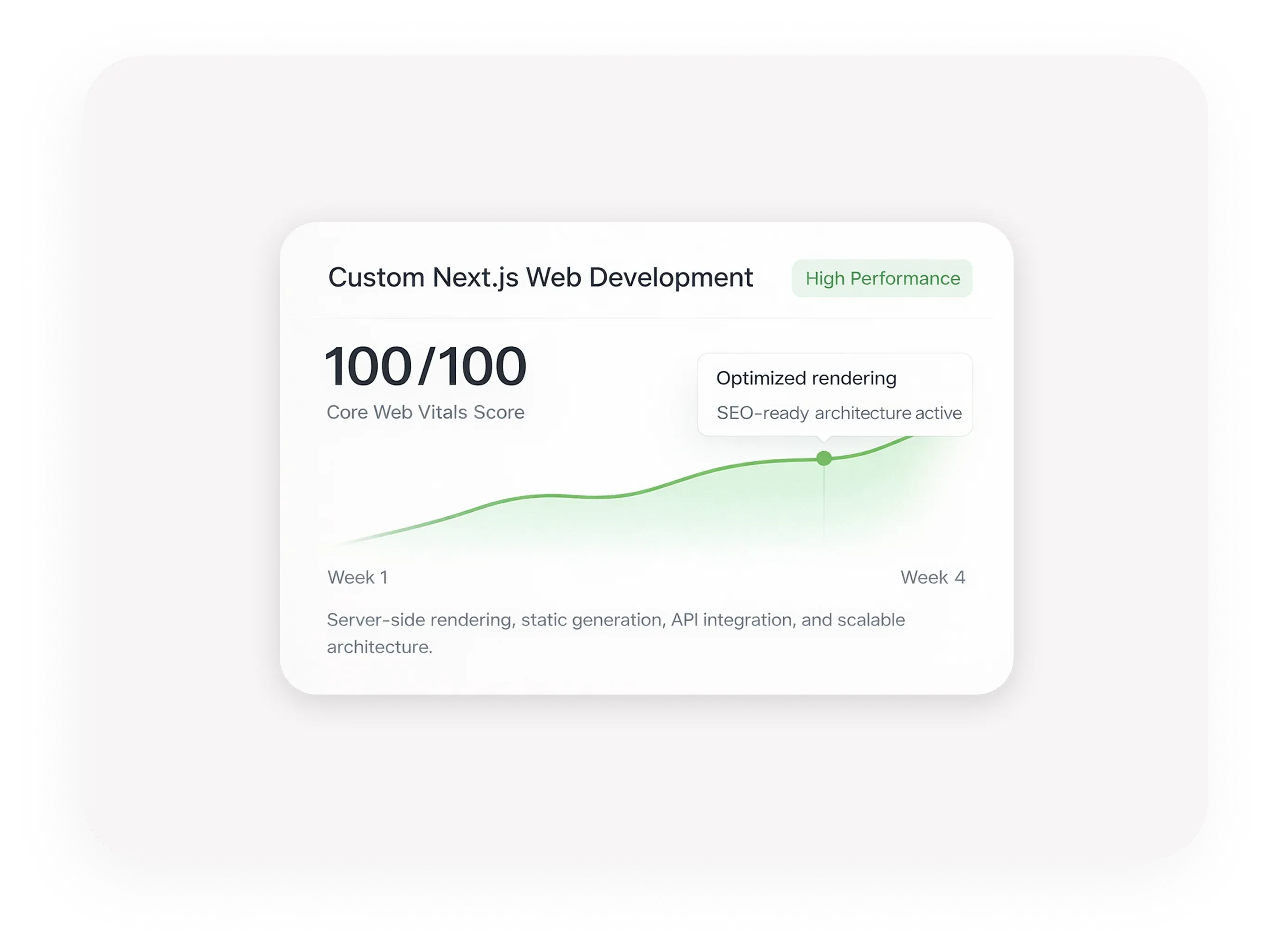 Future-ready Next.js solutions that support ongoing iteration, feature expansion, and traffic growth. Applications are built to adapt to changing requirements, new integrations, and evolving business needs without requiring architectural rewrites or disruptive refactoring.