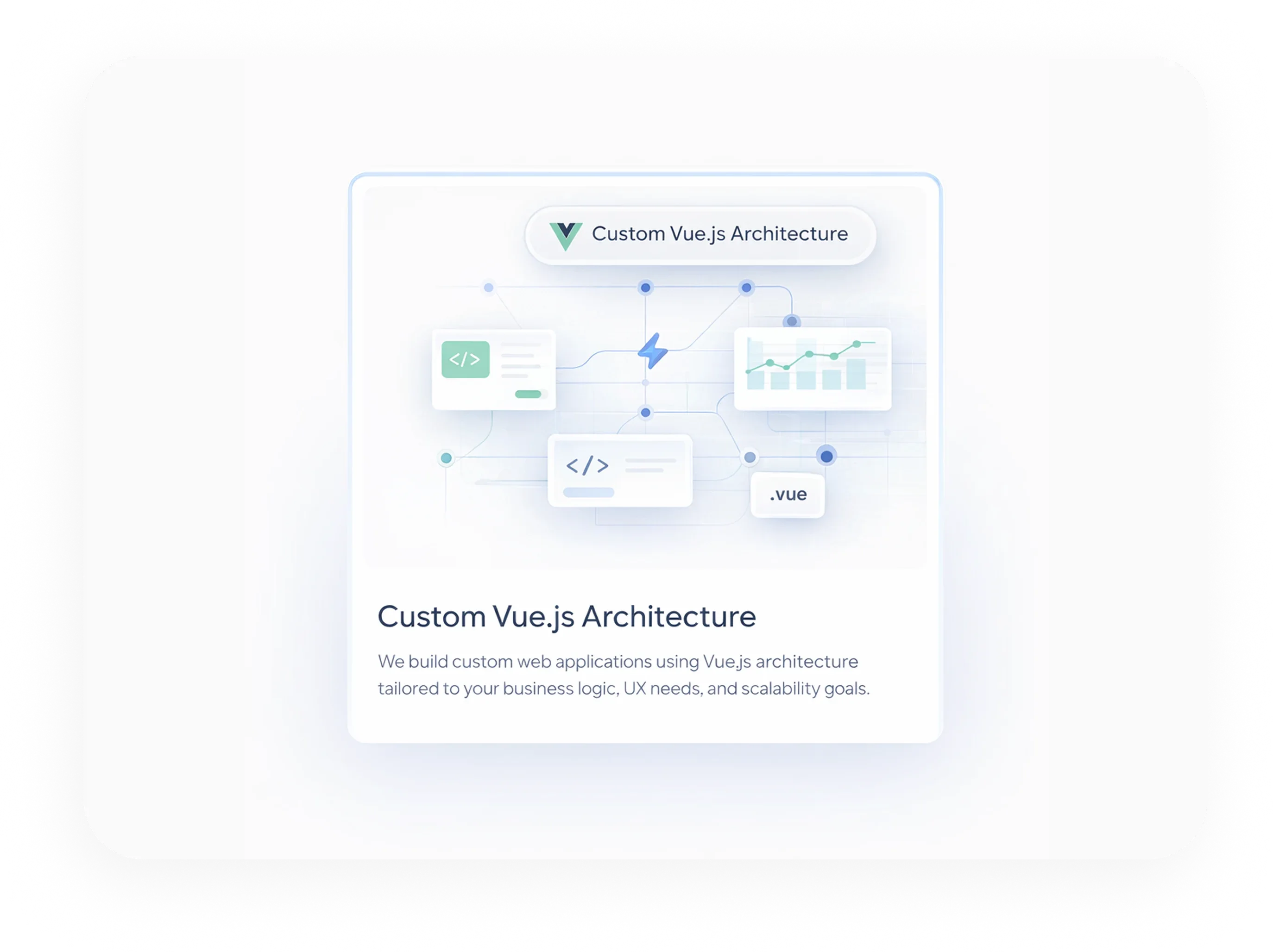 Enterprise-grade Vue.js applications are built to support large user bases, complex business logic, and long-term evolution. We design front-end architectures that integrate seamlessly with existing systems, APIs, and back-end services while maintaining performance and consistency across the application lifecycle.